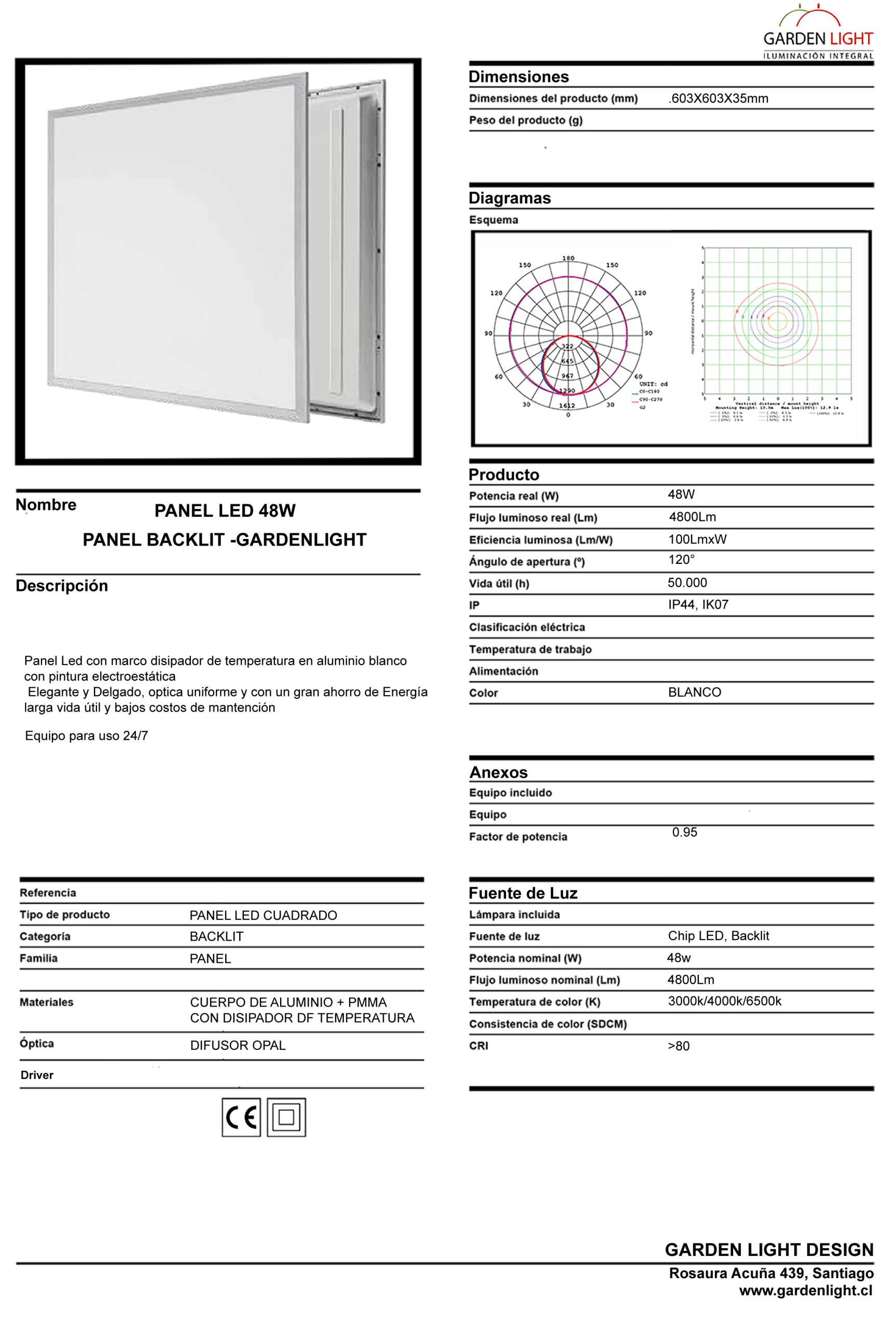 Panel LED cuadrado con disipador de temperatura en aluminio blanco con pintura electrostática. Diseño elegante y delgado, óptica uniforme y eficiente. Ideal para uso continuo 24/7, con gran ahorro energético y bajos costos de mantención.