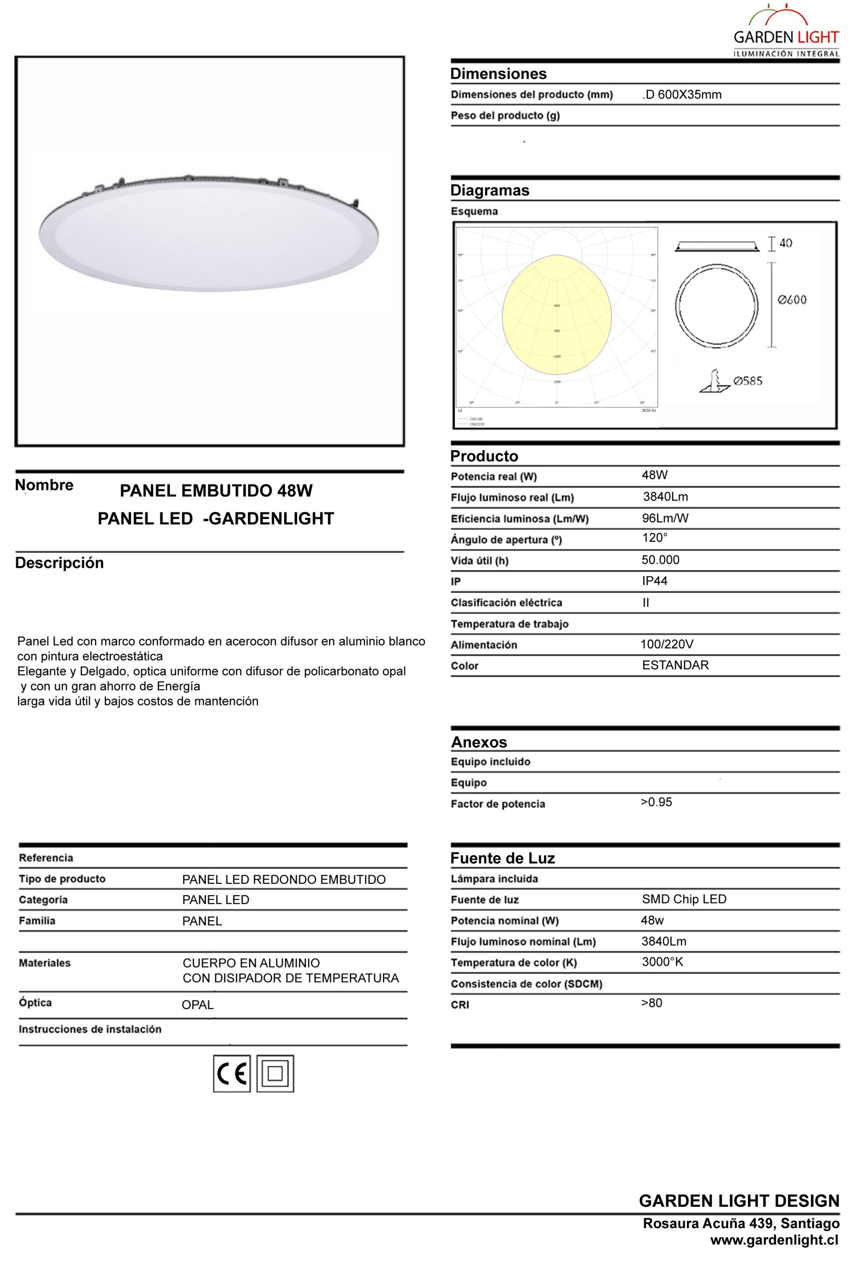 Panel LED circular embutido 48W de formato redondo diámetro 600mm profundidad 35mm. Cuerpo en aluminio conformado para empotrar en cielo. Diámetro interior 580mm. Difusor opal para iluminación suave.