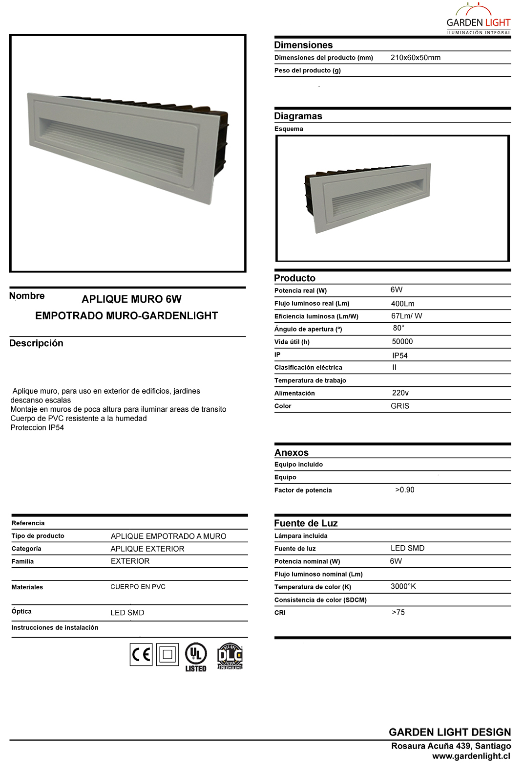 Aplique muro exterior empotrado 6W para jardín, apto para uso residencial, comercial e institucional, con materiales de policarbonato y cristal templado, IP65 para exteriores y alta eficiencia luminosa.