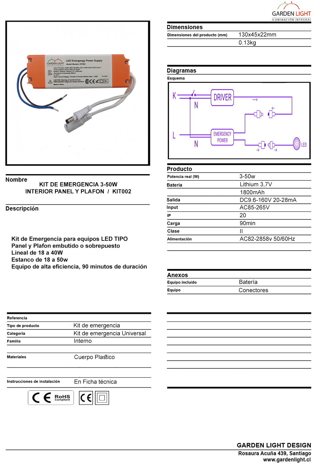 Kit de emergencia para equipos LED tipo panel y plafón, tanto embutidos como sobrepuestos, compatible con modelos lineales y estancos de 18 a 50W. Permite hasta 90 minutos de autonomía, ofreciendo alta eficiencia y fácil integración.