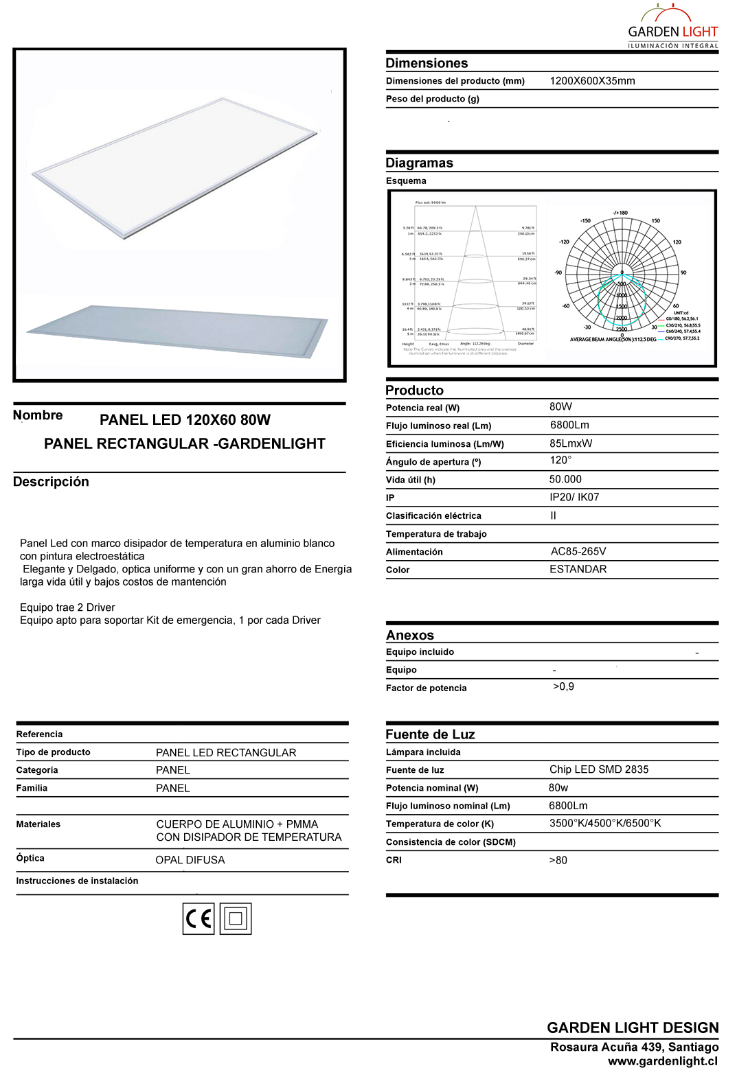 Panel LED rectangular 80W formato 1200x600mm. Cuerpo de aluminio con difusor translúcido. Incluye dos drivers independientes y sistema de emergencia autónomo 3h. LED de alta potencia para iluminación profesional. Difusor opal uniforme 120°.