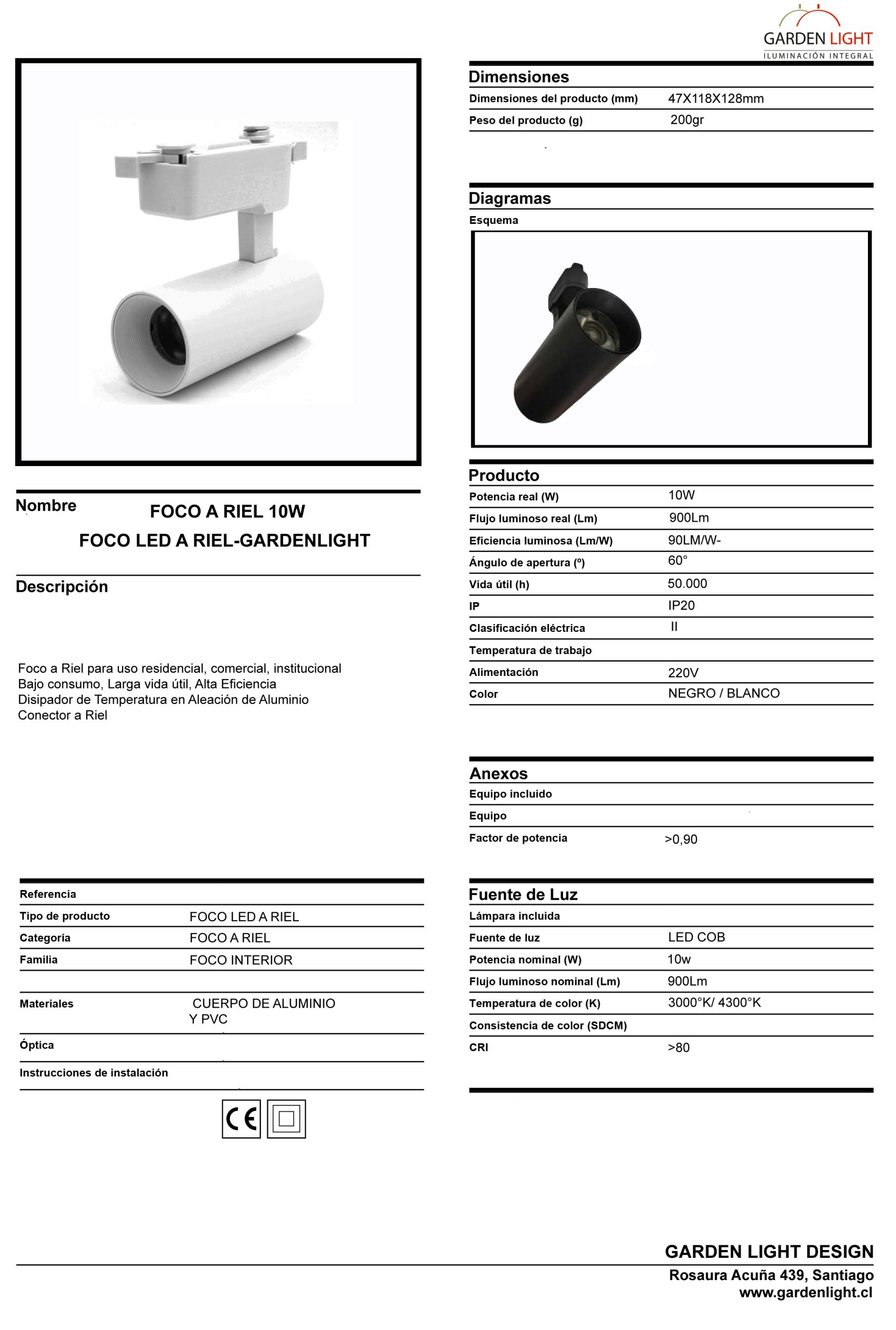 Foco a Riel para montaje en riel monofásico para uso residencial, comercial e institucional. Bajo consumo a 10W con gran luminosidad. Disipador de temperatura en aleación de aluminio. Conector a riel monofásico. LED COB integrado de alta eficiencia. Dimensiones de 47x118x128 mm y peso de 200g. Protección IP20 para uso interior. Temperaturas de color duales disponibles.