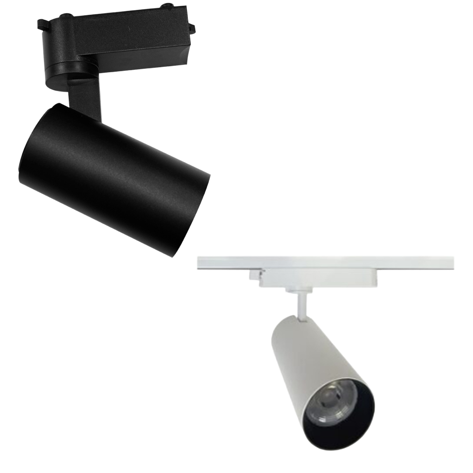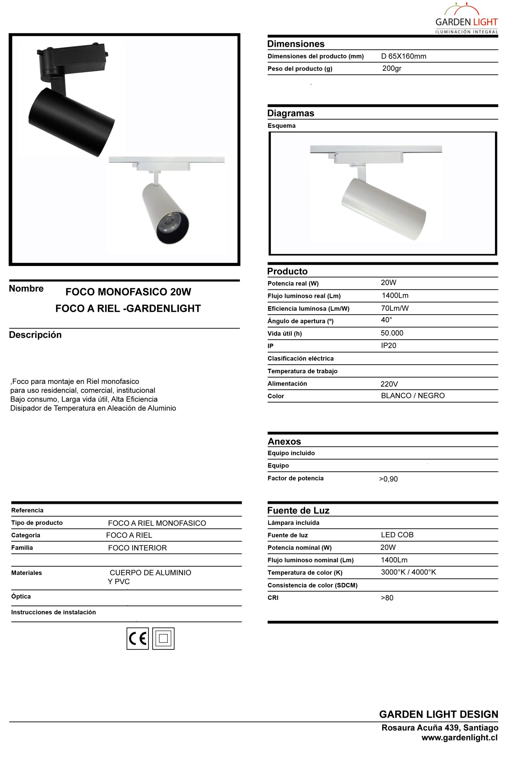 Foco a Riel versión alternativa para montaje en riel monofásico para aplicaciones residenciales, comerciales e institucionales. Potencia 20W optimizada. Disipador de temperatura en aleación de aluminio. Conector a riel monofásico. LED COB de alta eficiencia. Dimensiones de 70x136x153 mm y peso de 200g. Protección IP20. Configuración optimizada para cobertura de zona.
