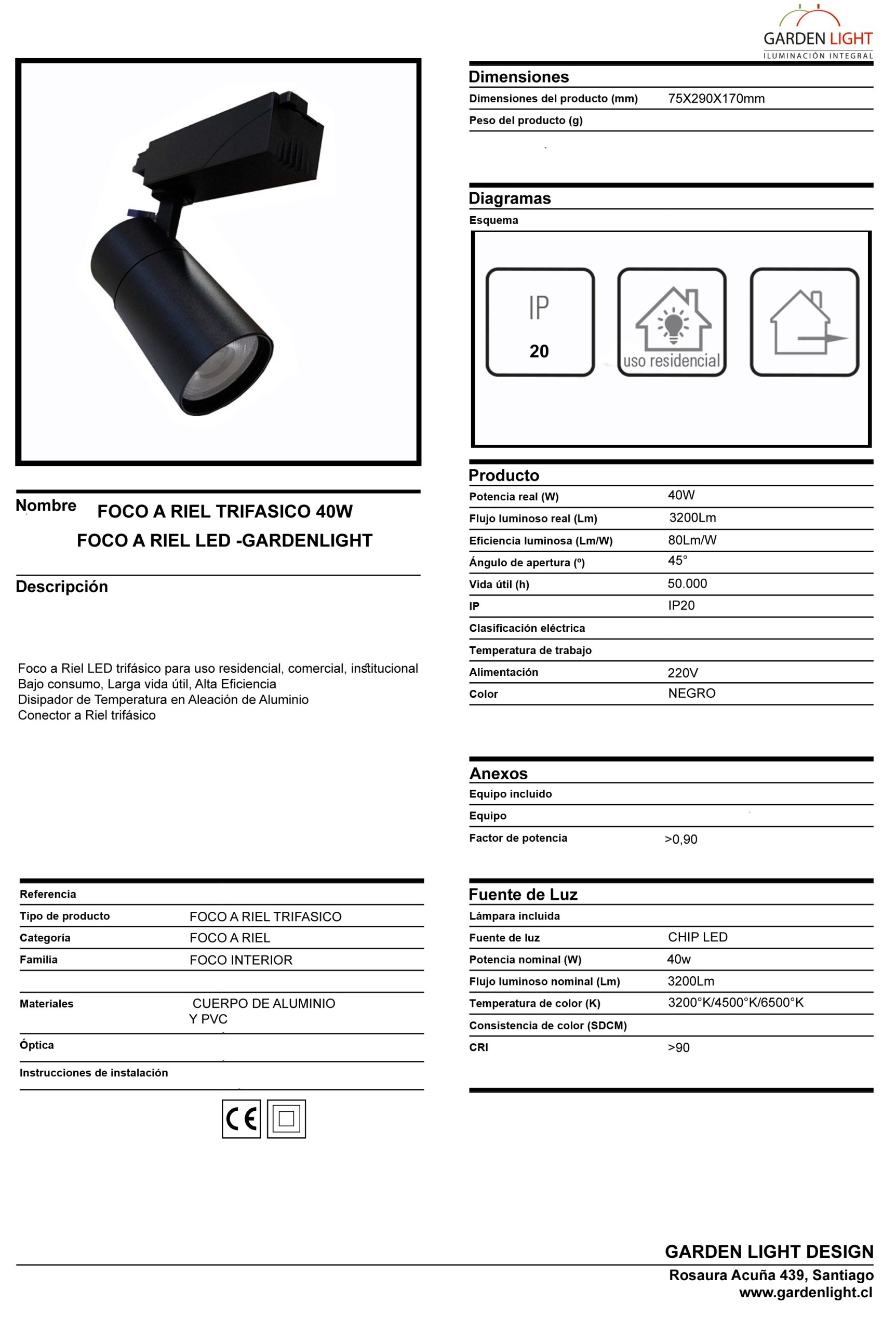 Foco a Riel para montaje en riel trifásico para uso residencial, comercial e institucional de potencia alta. 40W con excelente flujo luminoso para proyectos grandes. Disipador de temperatura en aleación de aluminio. Conector a riel trifásico. LED CHIP integrado de alta confiabilidad. Protección IP20 para uso interior. Temperatura de color estándar.