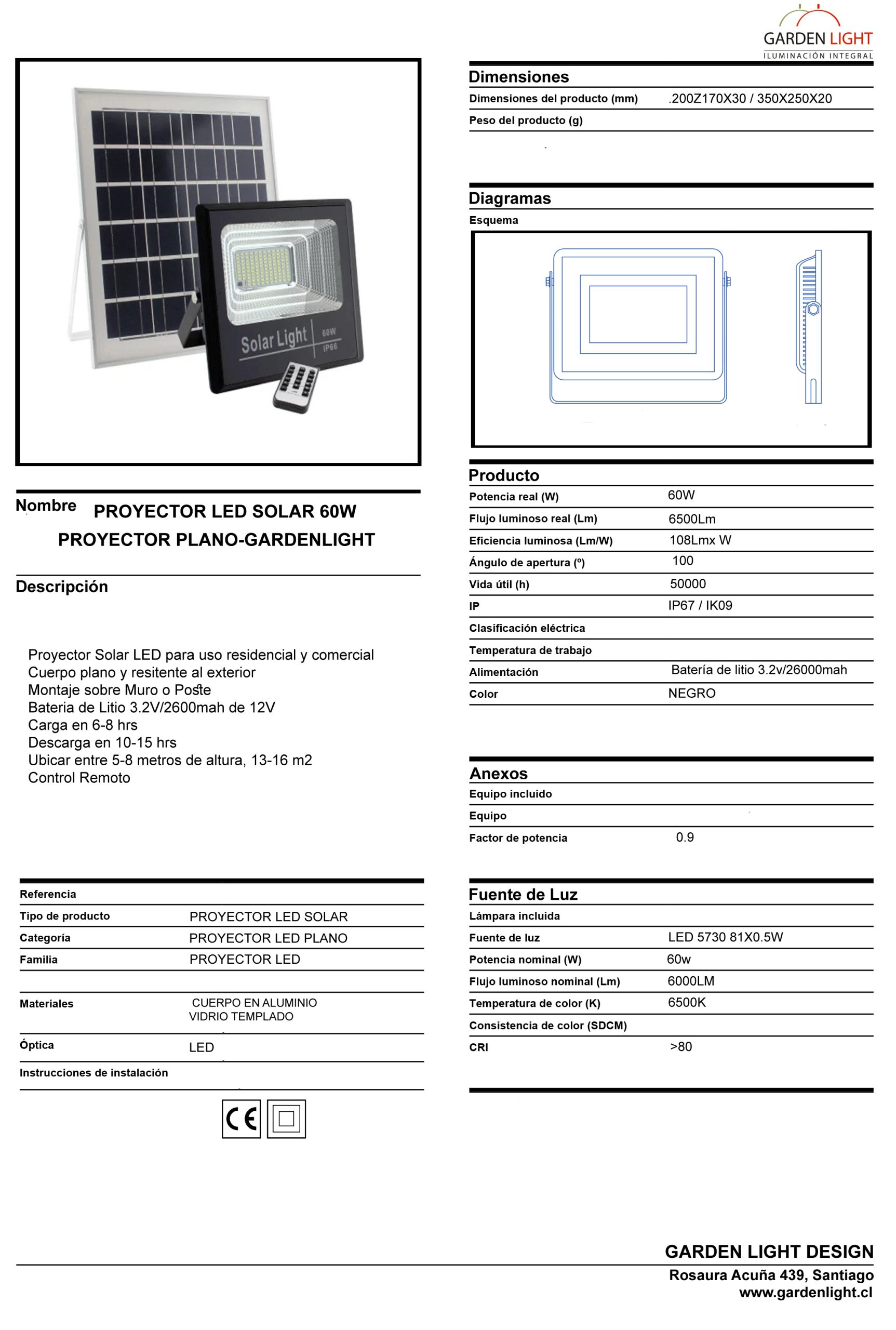 Proyector Solar LED para uso residencial y comercial. Cuerpo plano y resistente al exterior. Montaje sobre muro o poste. Batería de litio 3.2V / 2600mAh de 12V. Carga en 6-8 horas. Descarga en 10-15 horas. Ubicar entre 5-8 metros de altura (13-16 m2). Control remoto para programación de funciones. Incluye fotocelda con sensor de movimiento.