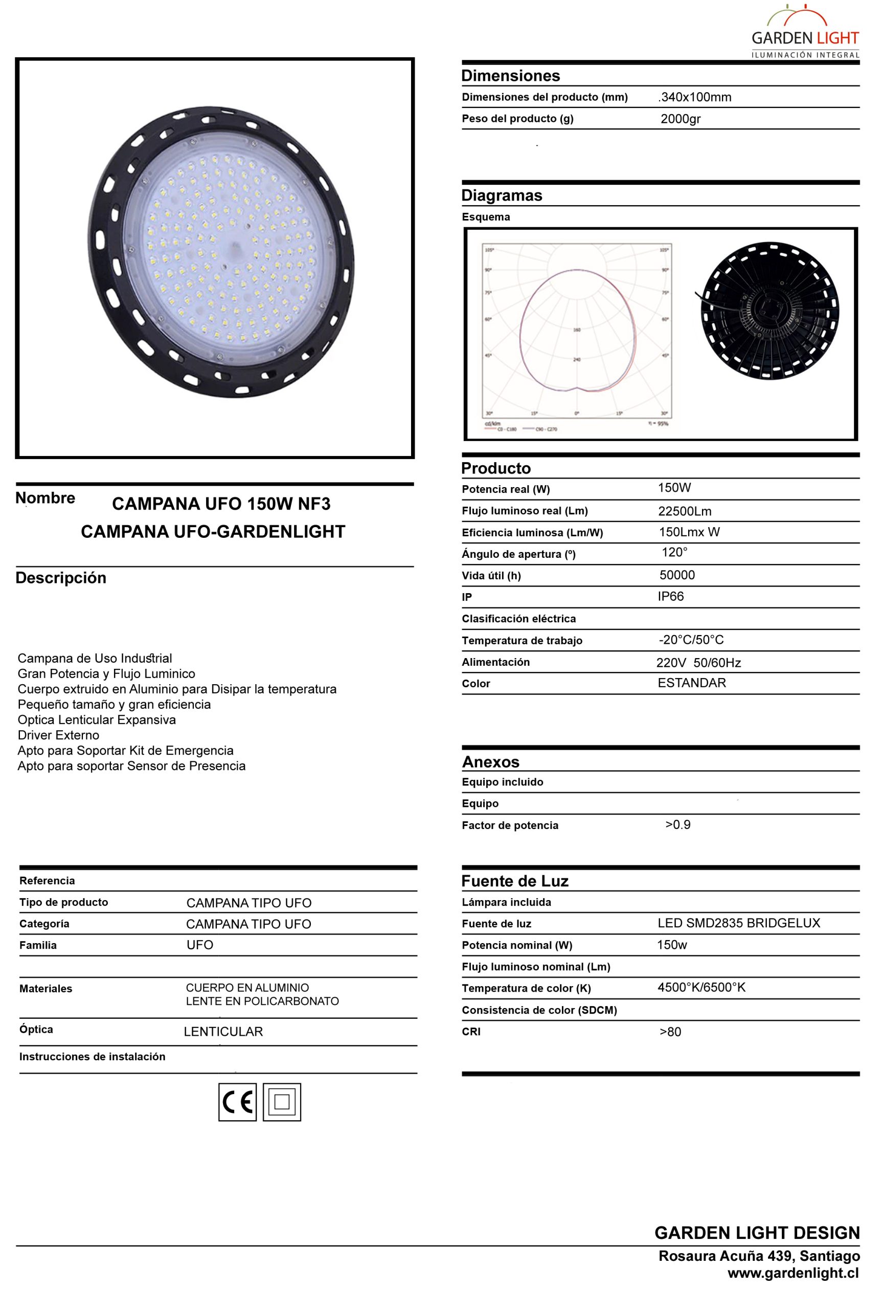 Campana colgante industrial UFO NF3 150W Gardenlight, optimizada para altas temperaturas con disipación superior, placa frontal de aluminio y lente policarbonato, para entornos industriales exigentes con alta presión de chorro.
